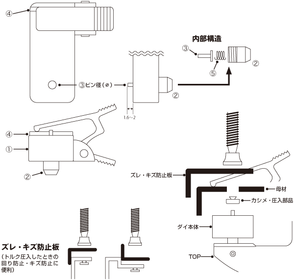 今まであきらめていた、加工後や処理後のオーバーハングのフランジなどにファスナー・スペーサーをカシメたり、圧入加工することができます